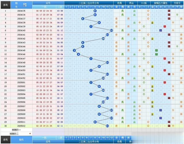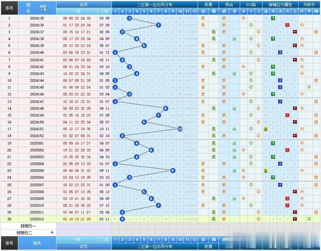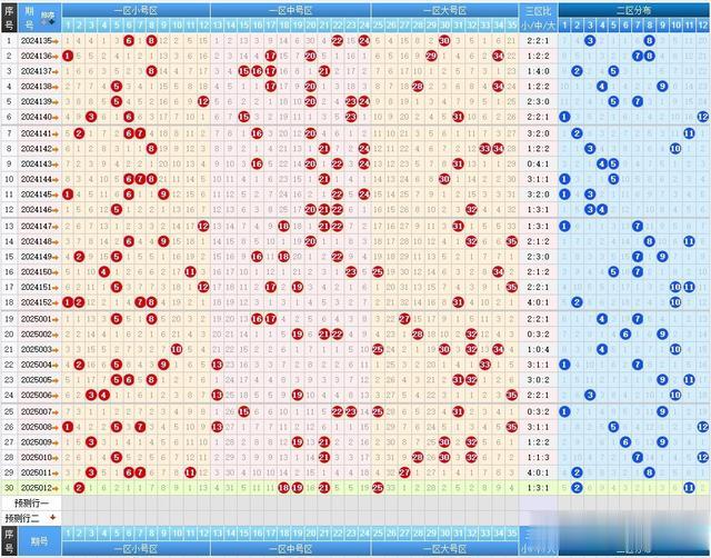 最近10期前区奖号三区号码比为19:13:18,二区号码表现相对冷淡。基于这一趋势,本期预测三区奖号将趋于平衡,推荐三区比为2:2:1。