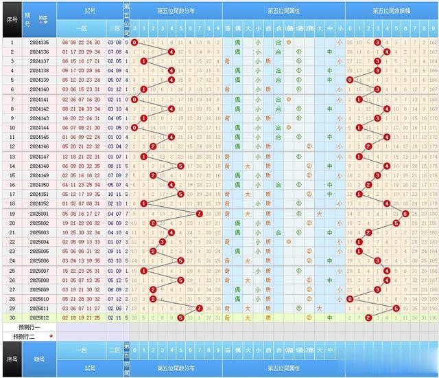 上期凤尾开出1路号码25。近5期凤尾012路号码分别开出1个、1个和3个。本期预计凤尾将开出0路号码,推荐号码为30。