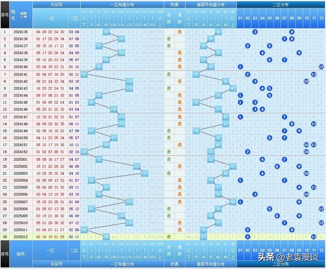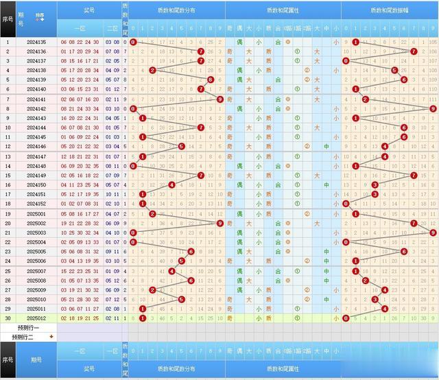 前区重号分析:上期未开出重号,但最近10期中有3期包含了重号。基于此,本期适当关注重号的回补,预测将出现2个重号,并推荐重号02、19。