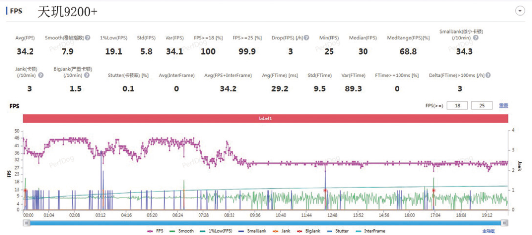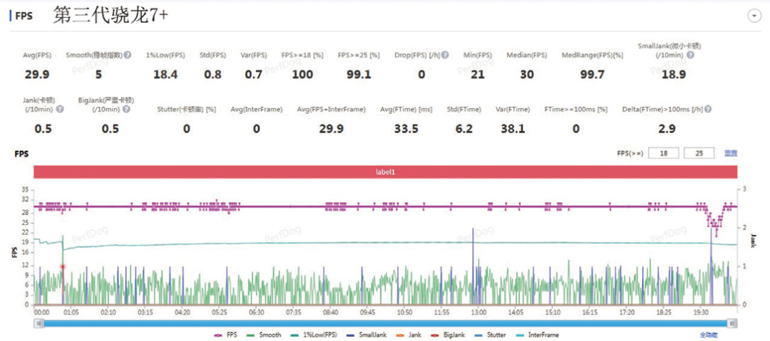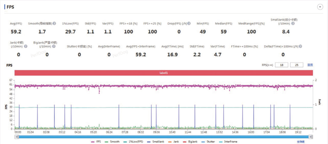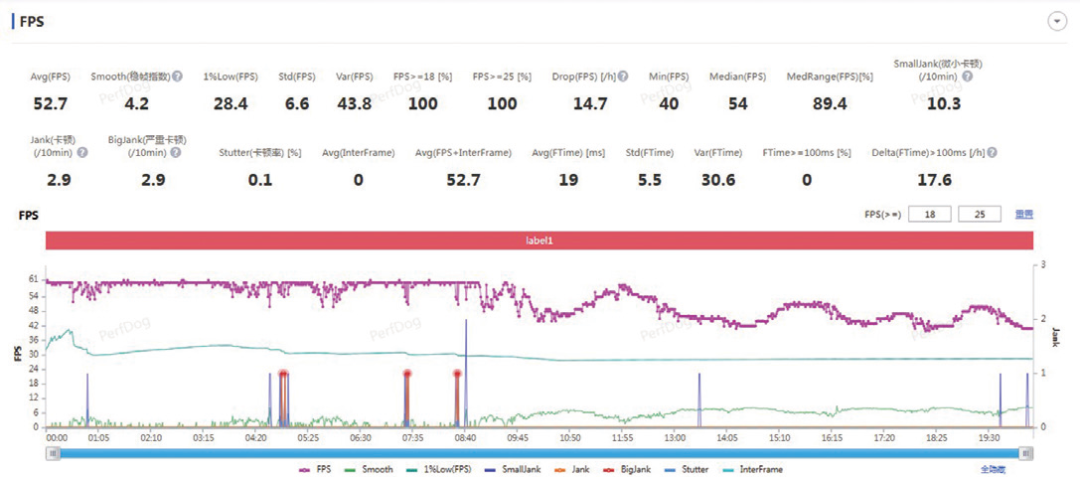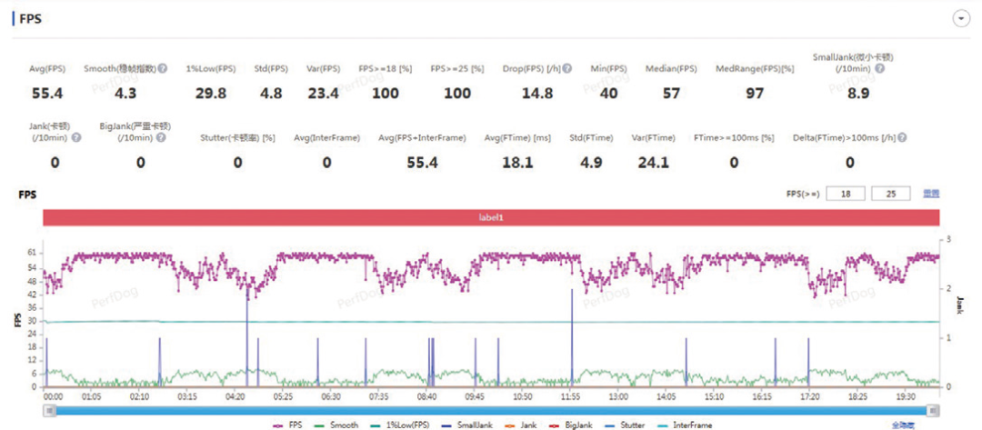 2.Smooth稳帧指数:对游戏或者应用画面平稳度更精准地评估,一般游戏和视频测试中该数据应小于8(应用类App滑动时应小于20),数值越小越好。