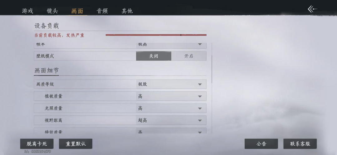 游戏设置:画面风格选择“十六声”,画质等级设置为“极致”,视野距离设置“超高”,植被质量、光照质量、特效质量、Bloom等设置为“高”,开启实时太阳光、TAA抗锯齿,关闭壁纸模式,帧率设置为可选的最高(目前部分机型已开放“极高”60fps)。