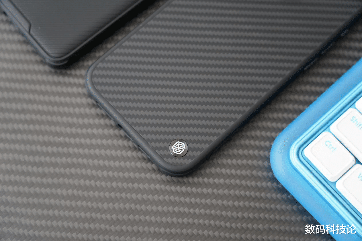 从材质上来说也是TPU软边拼接技术,不过背板使用的是碳纤维纹理的芳纶纤维,并且在手机手机壳的右下角还有一个金属标,给人的感觉依旧是商务风格,但细节上看的话还是高端不少,手感上几乎和我的碳纤维鼠标垫有一拼。