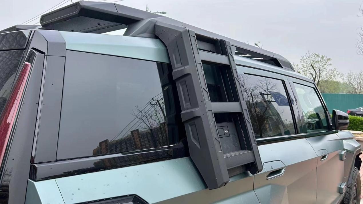 猛士917的车尾同样强调了科幻的设计味道,尾灯组采用不规则造型,占据了后窗两侧很大面积,横向线条与腰线衔接,进一步增程车尾的立体感。尾门采用侧开式结构,小尺寸备胎以书包形式外挂。后包围与车头设计风格相同,均采用了较为粗壮的黑色杠体,同时也为抬高设计,带来了较大的离去角。