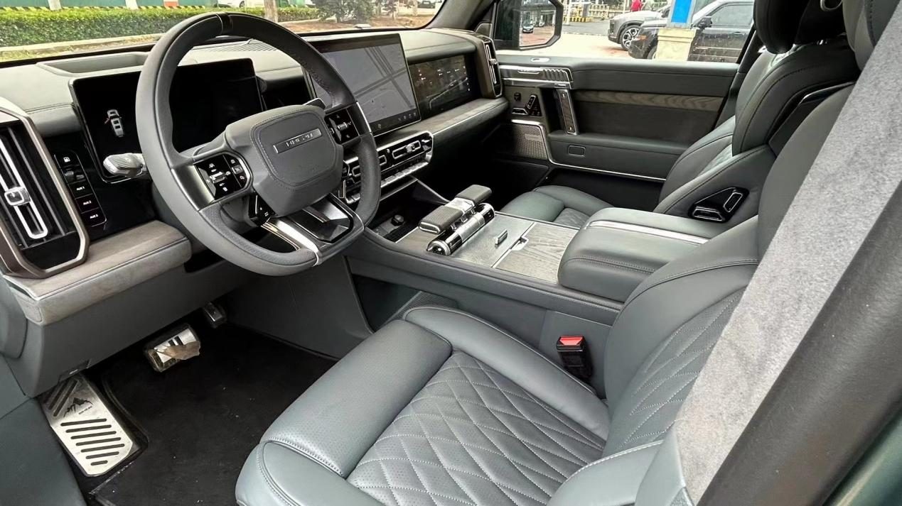 猛士917外观机甲硬派,内饰却十分豪华科技,带来了鲜明的对比。中控台采用大面积的软性材质包裹,与传统硬派SUV反差极大。中央配备了大尺寸悬浮屏,副驾驶一侧同样配备了内嵌式娱乐屏。挡把的设计参照了飞机推杆元素,各类按键布局规整,机械感力量感十足。