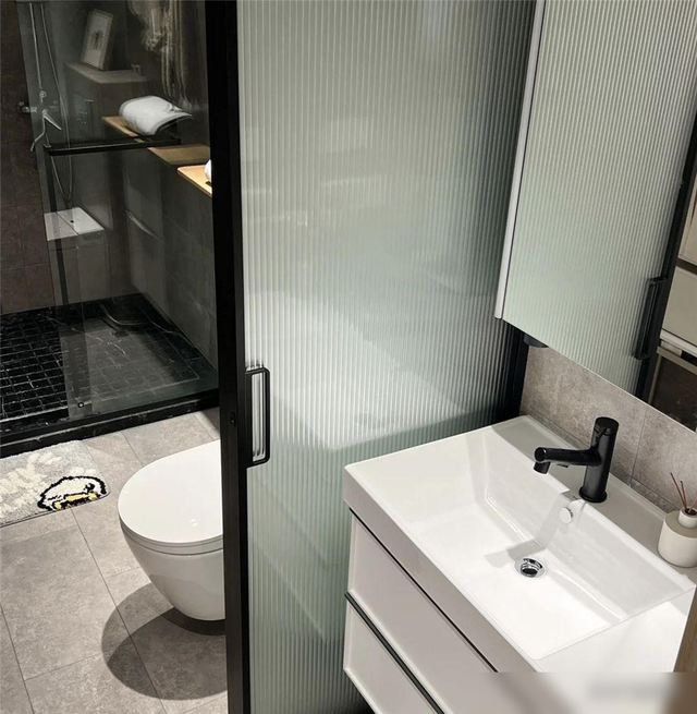 但并不是每个区域之间都有着完全隔开的墙面,而是只有淋浴区作为独立区域,其余两个区域之间有隔板作为分隔,这种方式称之为“伪三分离”设计。