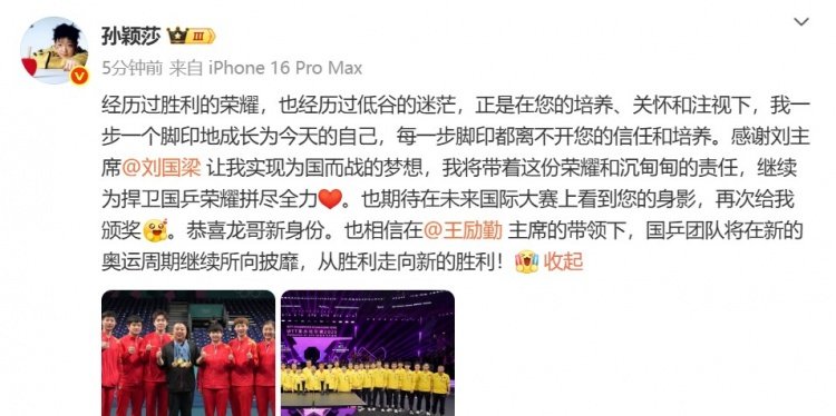 而对于刘国梁主动辞职,孙颖莎也是在社媒告别刘国梁,她先是表示,自己经历过胜利的荣耀,也经历过低谷的迷茫,自己的成长离不开刘国梁的培养和信任,感谢刘国梁让自己实现为国而战的梦想,自己接下来会继续为捍卫国乒荣耀拼尽全力。