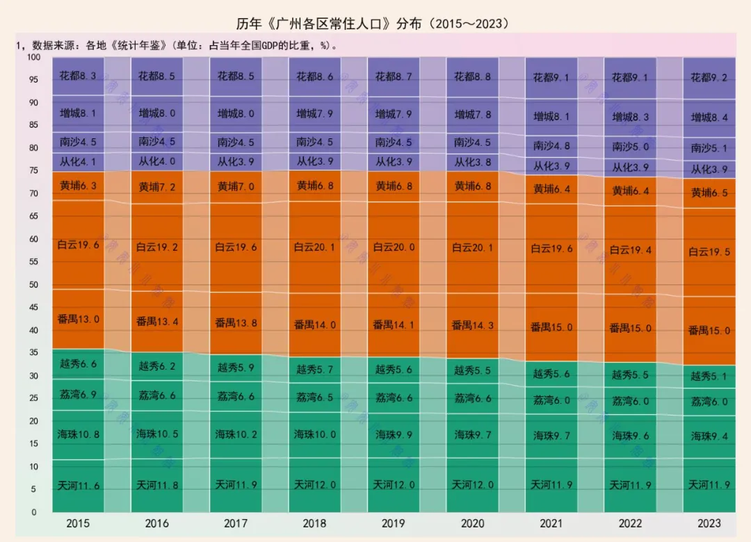 从经济规模看,广州在过去很长一段时间内,是GDP仅次于北京和上海的全国第三城。后来,深圳GDP超过了广州。再后来,重庆也超过了广州。2024年,论经济规模,广州是全国第五城。但千年通商口岸的底蕴,让广州看起来仍然是那个迷人的现代化大都市。2014年,广州调整了行政区划,将原黄埔区和萝岗区,合并为新的黄埔区。至此,广州的市辖区格局调整为:一,中心城区:越秀区、荔湾区、海珠区和天河区,这是广州的四个中心城区。珠江新城集聚了全市40%的金融机构和60%的跨国公司地区总部,这是中心城区的底蕴之一。二,新城区:白云区、黄埔区和番禺区,紧紧包裹着前述的四个中心城区,是广州第二层级的城区。三,南沙区、花都区、从化区和增城区,则是前述三个新城区的对外扩展区域。但你知道,广州11个市辖区的分布规律?以及哪个区最大吗?通常,我们使用人口、面积和GDP三大指标,来展示各区域的分布情况,并使用前述三个指标,来排出最大和最小。这一篇,我们只从人口的角度,观察2015年以来,广州11个市辖区的常住人口变化情况。