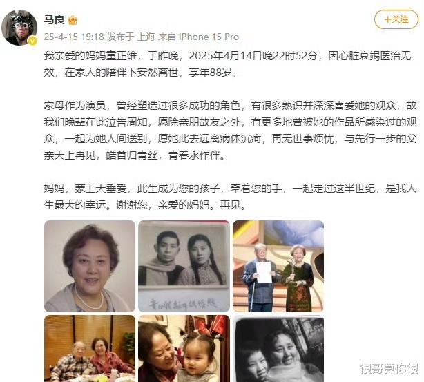 2025年4月14日晚22时52分,著名演员童正维因心脏衰竭医治无效,在家人的陪伴下安然离世,享年88岁。其子马良通过个人微博发布讣告,证实了这一令人悲痛的消息。