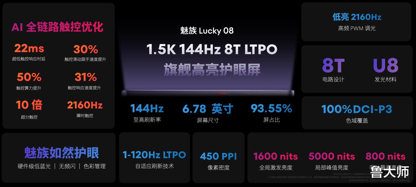 为了给手机用户带来更好的屏幕视觉效果,魅族 Lucky 08 采用一块 6.78 英寸 8T LTPO 144Hz 1.5K 高分辨率旗舰护眼直屏,峰值亮度达到 5000 nits,在户外强光底下也依然清晰可见,搭配全面优化的 AI 全链路触控技术,响应速度提升 50%,并达到 10 倍超分触控体验。