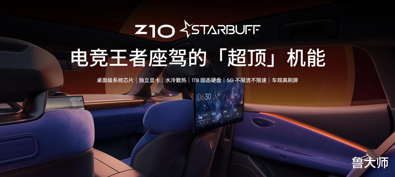 Z10 STARBUFF 电竞娱乐座舱拥有媲美 PC 电脑的游戏机能,搭载包括亿咖通·马卡鲁计算平台、AMD V2000A 桌面级芯片、 AMD RX6600M 独立显卡、水冷散热、三星 OLED 车规高刷屏、1TB 固态硬盘以及 5G 高速车载网络在内的众多硬核设备。
