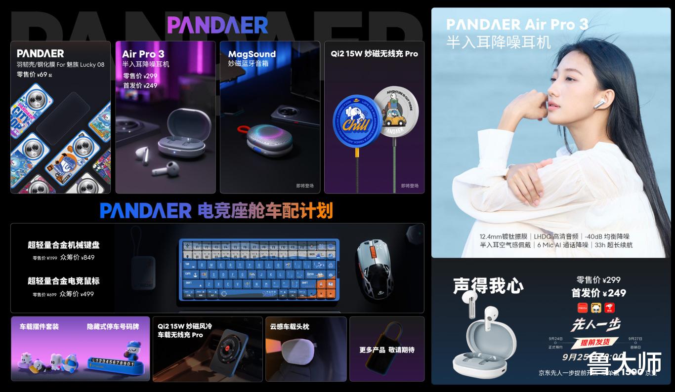 PANDAER Air Pro3 半入耳降噪耳机,音质更出色与魅族 Lucky 08 AI 手机同时发布的还有魅族旗下潮流科技品牌 PANDAER 的众多新品,包括魅族 Lucky 08 专属手机壳魅族 PANDAER 羽韧壳及秒贴钢化膜、Air Pro3 半入耳降噪耳机、MagSound 妙磁蓝牙音箱、Qi2 妙磁无线潮充等。