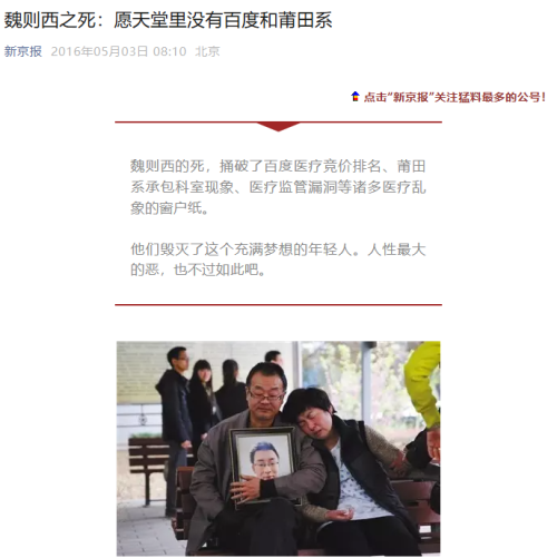 魏则西的死,捅破了百度医疗竞价排名、莆田系承包科室现象、医疗监管漏洞等诸多医疗乱象的窗户纸。