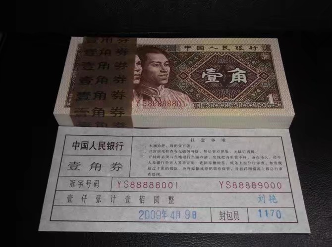 最后普及一个纸币方面的小知识,在本文中也提过,纸币的数量单位,一般来说,除了单张纸币外,一刀是100张连号,一捆是1000张连号,一条是5000张连号,5元以下的一包是四万张,5元以上的一包是10000张,包是银行内部储存纸币单份的最大单位。