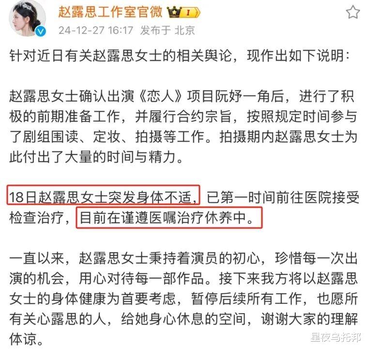 之后,工作室也发文回应说:赵露思因为身体原因,已在12月18号入院治疗。