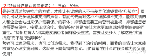 说自己确实有在营销,但只是想让更多的人关注到抑郁症这个事情。