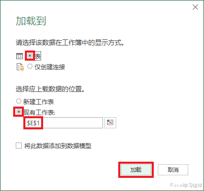 8. 在弹出的对话框中选择“表”--> 选择“现有工作表”及所需上传至的位置 --> 点击“加载”