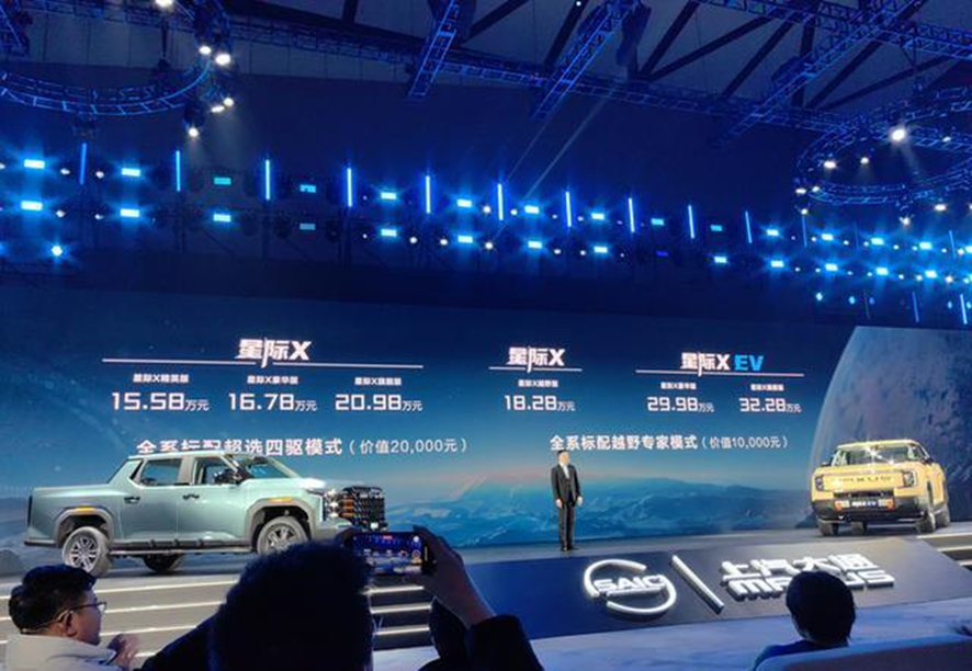 上汽大通星际X皮卡售15.58-32.28万,共6款配置,含燃油和纯电版。纯电版即带前备厢车型,起售29.98万,与小米SU7 Max相近,为国内首款前备厢皮卡。