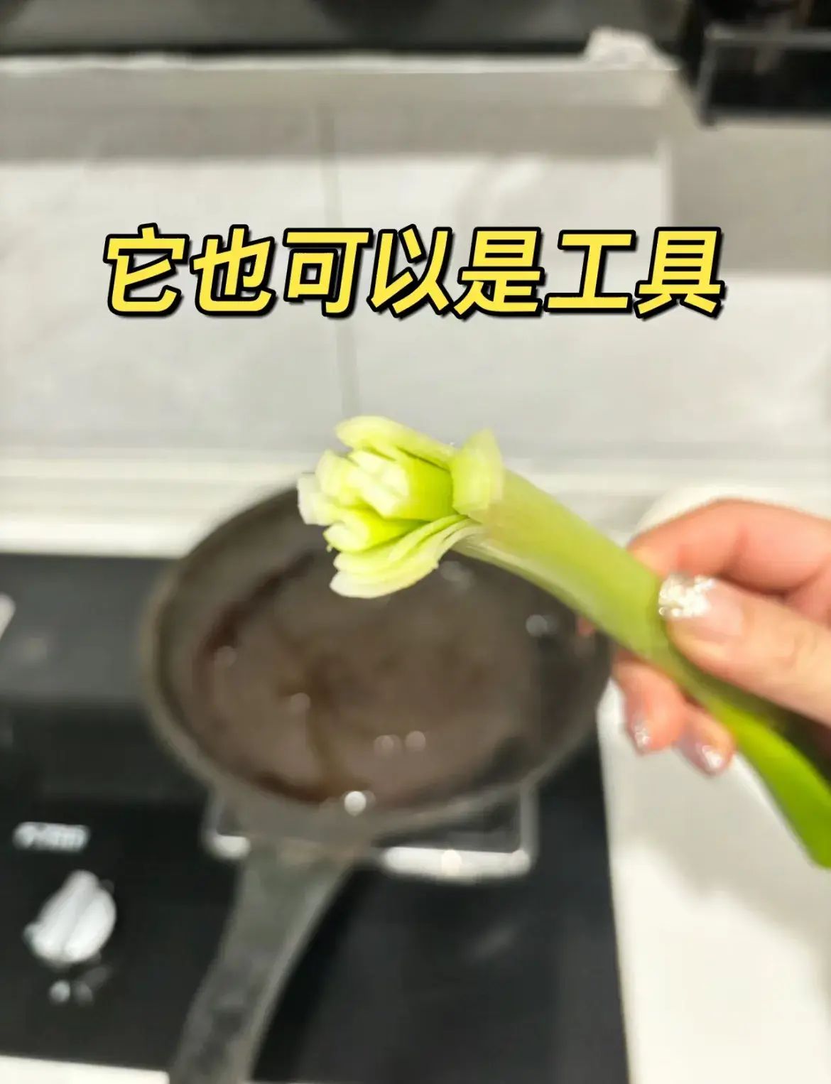 举一反三,如果这顿饭不用葱,也可以用筷子夹蘑菇,用土豆、香菜等一切这顿吃的食材刷,主打个就地取材、干净方便。