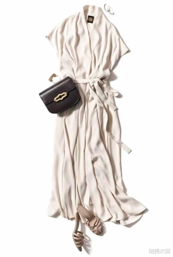 优雅米白连衣裙,腰带轻系,米色凉鞋与精致包包,既调和了轻重,还给风格定了性。
