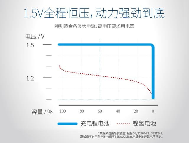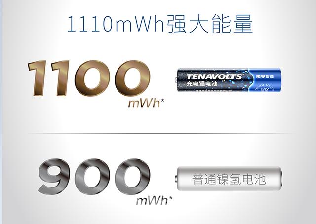 首先是能量大,由于南孚Tenavolts 7号充电锂电池采用了聚合物锂电芯,所以它单位体积储能更多,它的电芯能量高达1100mWh,比普通镍氢电池多22%;它的重量很轻,一节仅重8g,比普通7号镍氢充电电池轻得多。它还具有耐高温的特性,在0-40摄氏度均可稳定放电。