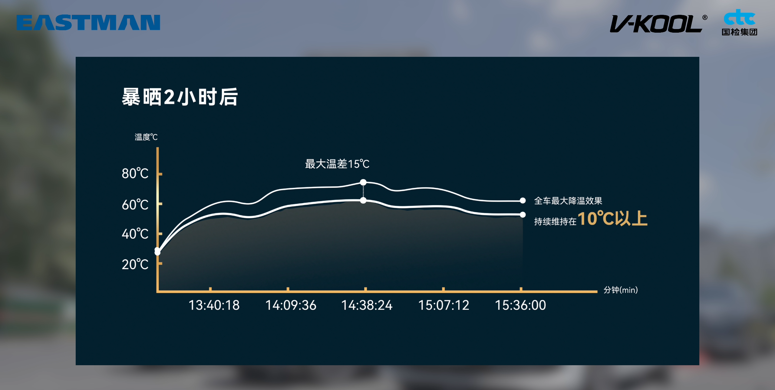 结果表明装贴威固VK+KC隔热窗膜的测试车辆,车内表面温度比未贴膜的车辆最高要低15℃,从未贴膜车辆与贴膜车辆的温度变化曲线来看,威固VK+KC隔热窗膜的最大降温效果可以持续维持在10℃以上。