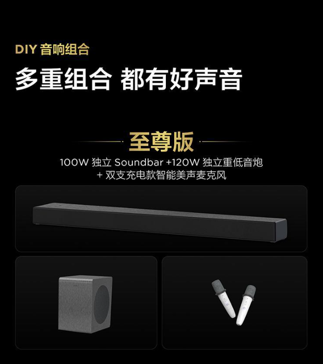 那要用来K歌的话,音效方面肯定不能差。店员告诉我K73 Max有三种方案可以任意选择,我对音效要求还是挺高的,一眼就看中了100WSoundbar+120W独立重低音炮组合,店员现场放了几首歌,这回音壁和独立重低音炮比普通电视内置音响强多了,层次感、环绕感特别强,声音像是从四面八方席卷而来,低音带劲而且不沉闷,K歌和看球赛的时候沉浸感都能拉满。