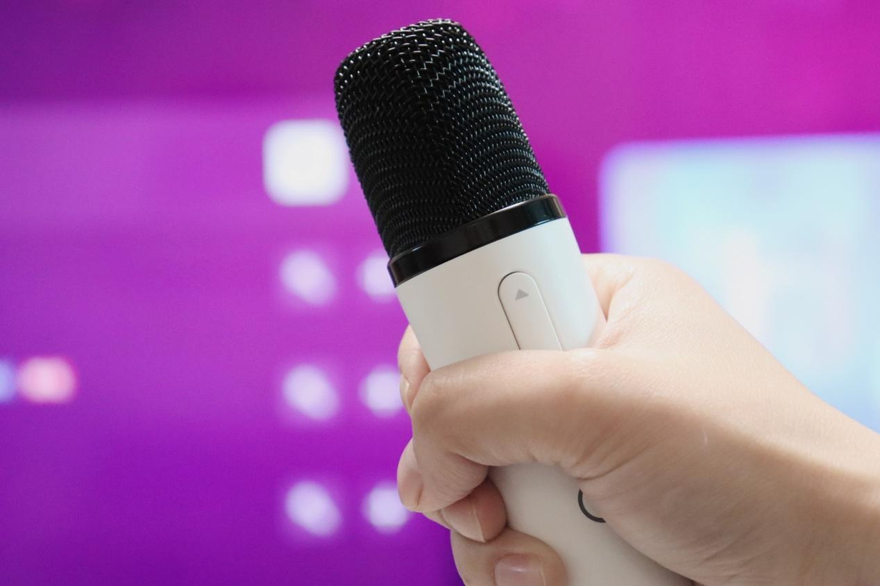 聊完音响,K歌还不能少的就是话筒。K73 Max配套的话筒采用了更先进的拾音技术,可以有效过滤噪音,还能防止刺耳的啸叫,而且延迟很低,我现场试了下,K歌时声音干净利落。另外它内置AI美声芯片,我那几个不太喜欢唱歌的朋友也能来凑个热闹。