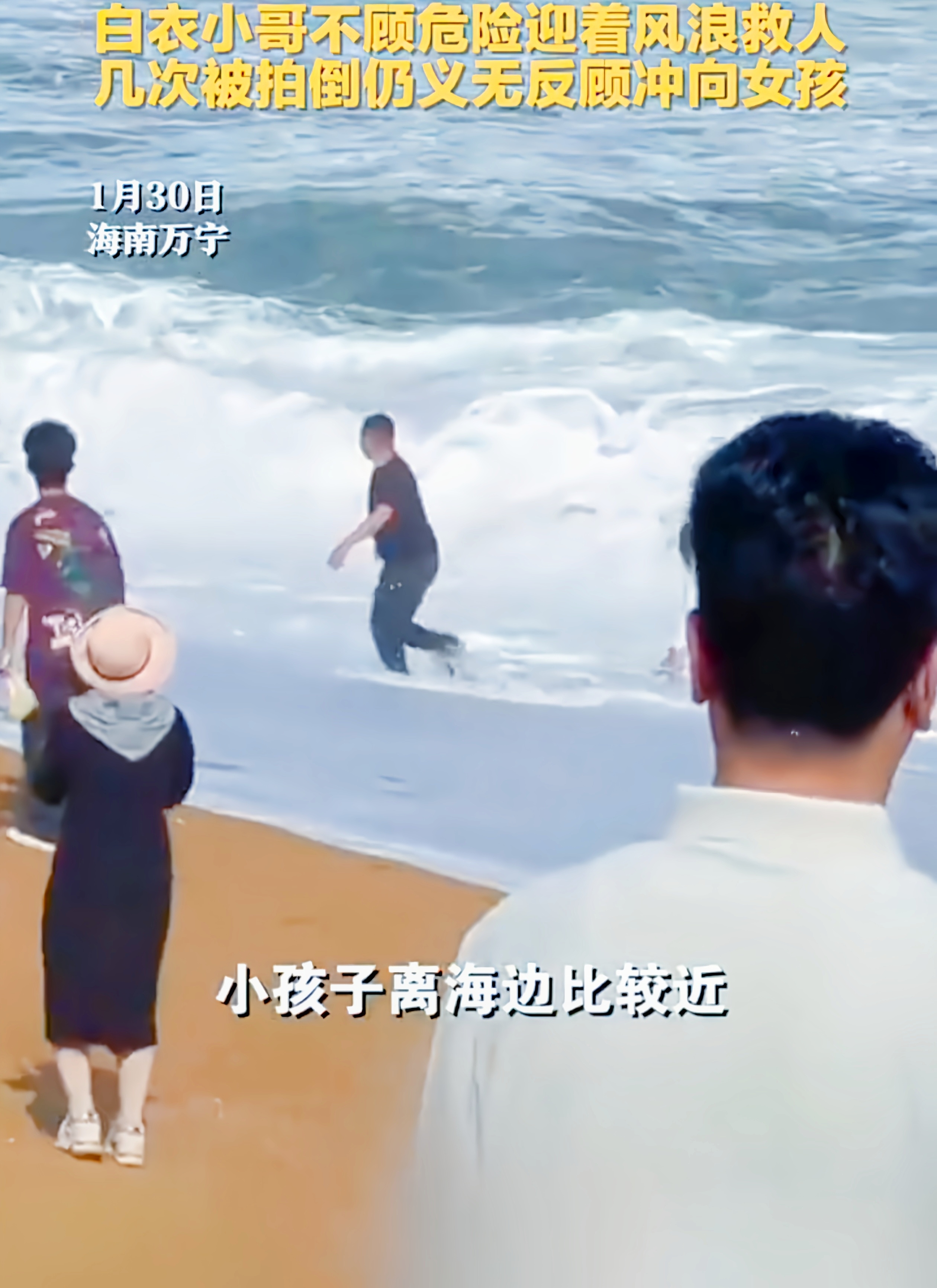 1月30日,海南万宁的海边,阳光洒在沙滩上,一切都显得那么平静美好。然而,危险却在不经意间降临。一个小女孩在海边玩耍时,被突然涌来的海浪无情地卷走。海浪像一头凶猛的野兽,一次次地将小女孩吞噬,情况万分危急。就在这千钧一发之际,一位白衣小哥出现了,他没有丝毫犹豫,迎着风浪冲向小女孩。海浪一次次将他拍倒,可他就像一棵坚韧的青松,被打倒后又迅速爬起,继续向女孩靠近。在白衣小哥和多名热心群众的不懈努力下,小女孩终于成功获救。