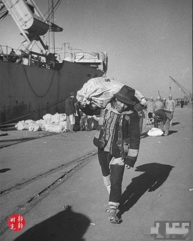 1945年11月,上海码头寒意彻骨。一男子搬运联合国难民署战后救援物资,他身着满是补丁的衣裳,脚踏草鞋,在冷风中瑟瑟发抖,尽显彼时百姓生活困窘,满是艰辛与无奈。