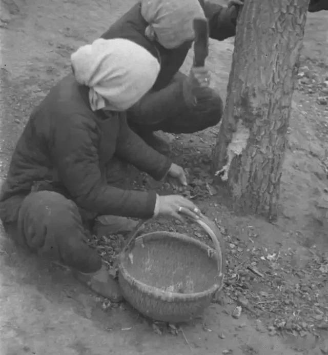 这是受灾难民在砍树皮充饥,手颤抖着,眼里含泪,每一下挥动斧头,都是对饥饿的抗争,只为能多撑过这艰难一天。