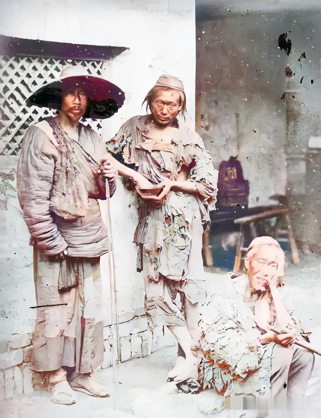 这是一群讨饭的乞丐,他们枯瘦如柴,衣衫褴褛似枯草挂身。深陷的眼窝藏着饥饿与绝望,哆哆嗦嗦伸端着破碗,在烈日中哀求,只为一口吃食,熬过苦难的一天。
