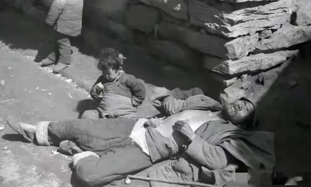 一位老人饿得瘫倒在地,面如死灰、气息奄奄,恐时日无多。身旁三四岁的女儿,满脸惊恐!