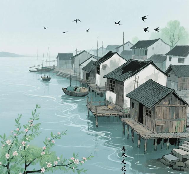 赏析:写渔家生活环境,借流水落花,营造出一种悠然的氛围。