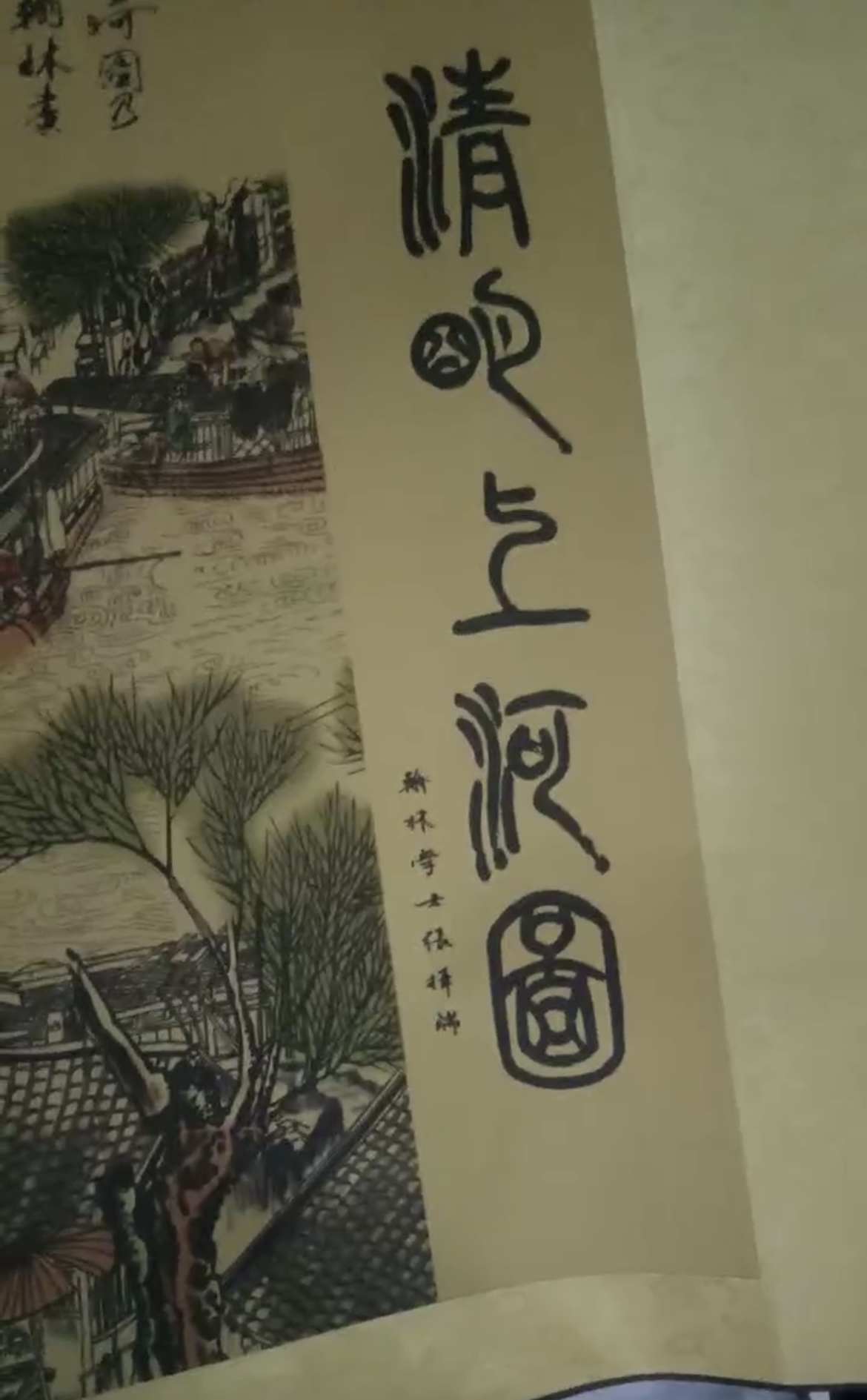 此藏品右侧以“清明上河图”五个大字开头,整幅作品看上去微微发黄,保存非常完整。画作还原了出张择端的原画,人物、房屋、树木、舟船、马匹无不刻画精细,行为动作,表情神态无不极具神韵。观其笔墨章法都很巧妙,可见功底深厚。如此巨幅作品精摹入微,在效仿前人的同时又表现出自己的艺术修养,历经岁月流传至今也已成为稀世珍品。此外,画作上部题写诗文,堪称诗画双绝,是不可多得的书画精品!