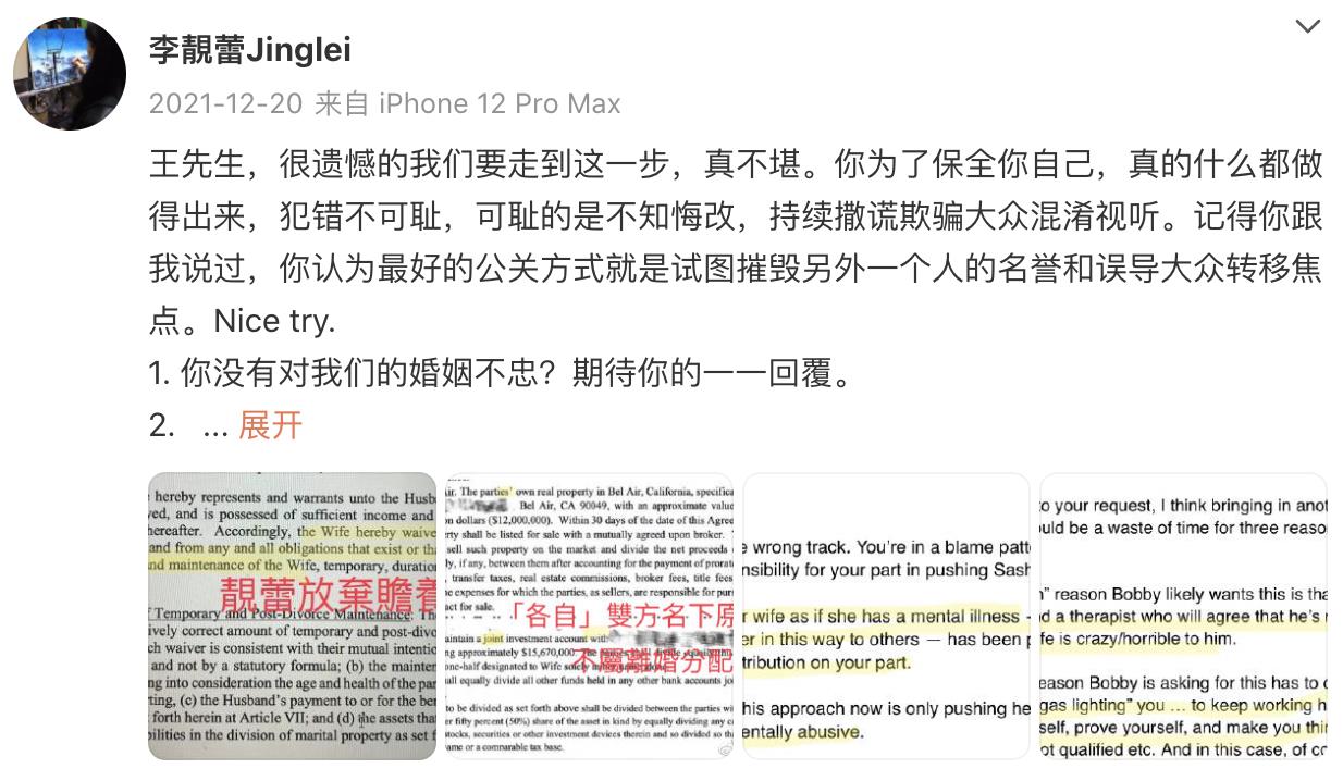 当然,事情的发展方向很迷离,李靓蕾一边控诉王力宏的罪行,王力宏方也在煽动舆论把李靓蕾刻画成一个心思歹毒的女人。