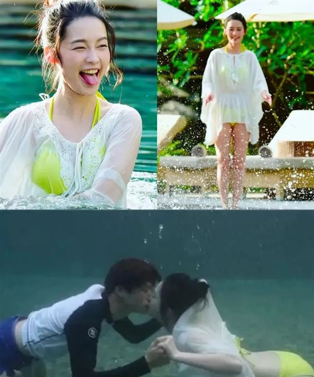 照片中,李沁身着透视白纱,搭配荧光比基尼,跃入水中。