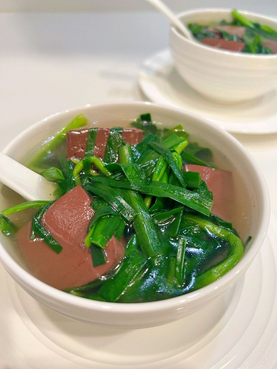 广东人深谙"以形补形"的饮食智慧,这道汤品就是典型代表。猪红(血豆腐)切块焯水去腥,与姜片一同煲煮;汤滚后加入韭菜段,调味后即可食用。猪红嫩滑如豆腐,韭菜提鲜去腻,汤色清亮却滋味浓郁,特别适合潮湿季节祛湿补血。