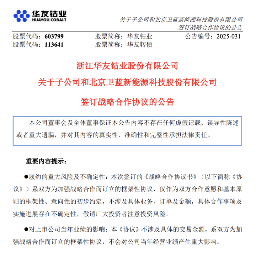 3月18日,华友钴业宣布其控股子公司天津巴莫与卫蓝新能源签署战略合作协议,双方将在固态电池领域展开合作,共享资源,合作期限为5年。