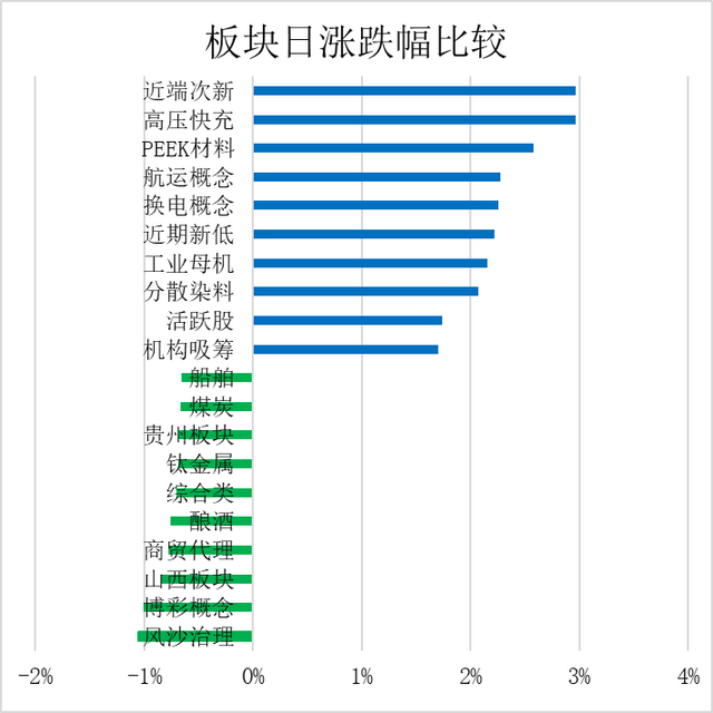 盘面上,高压快充、PEEK材料、航运概念、换电概念、工业母机、分散染料、矿物制品、黄金概念、水产品、家用电器等板块涨幅居前;风沙治理、博彩概念、白酒、钛金属、煤炭、船舶、食品饮料、农林牧渔、电力、钢铁等板块跌幅居前。