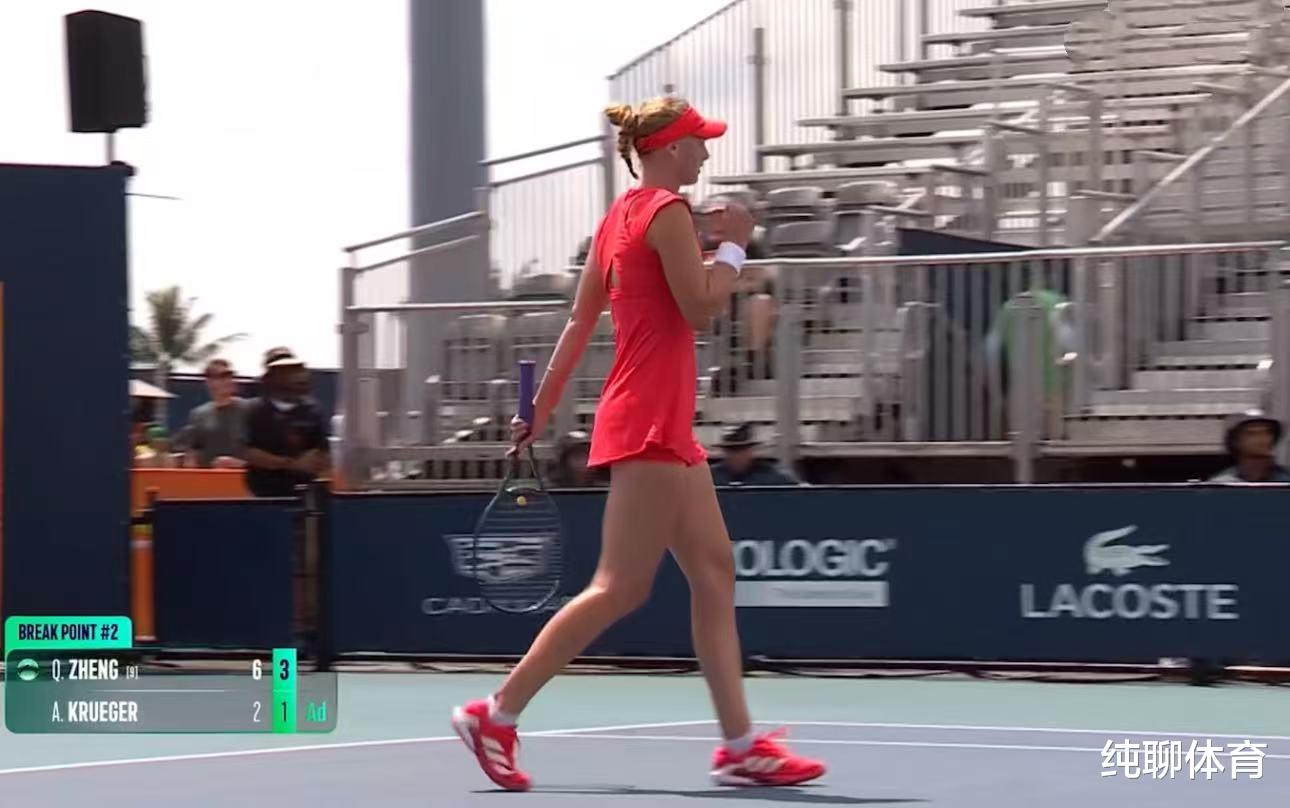第3局,郑钦文直落4分强势保发,局分来到3-0;第4局,克鲁格40-15获得两个局点,结果轻松保发,局分追至1-3;第5局,双方战至30-30平,郑钦文40-30获得局点,克鲁格连得2分拿到破发点,郑钦文挽救破发点,双方来到40-40平分,之后克鲁格又连得2分,实现了关键破发,局分追至2-3,没有让郑钦文将局分进一步拉开。