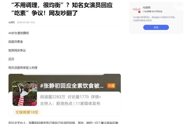 早在去年7月份,其实张静初就因上过一次热搜,因为她频率在社交账号分享“素食生活”。