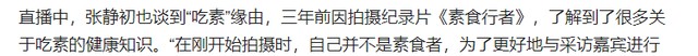 紧接着,张静初又表示自己之所以吃素,正是因为当年接触了一档纪录片《素食行者》。