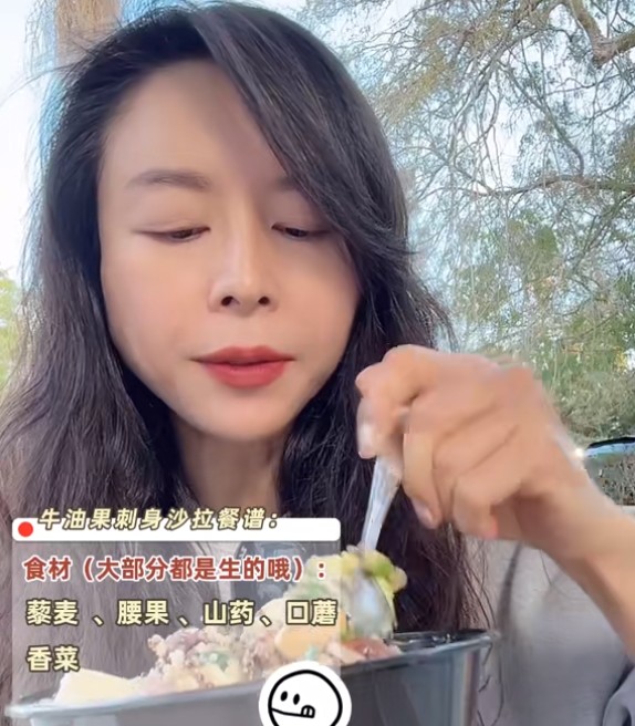 除此之外,她一边吃还一边说出了每个食材的功效,比如香菜排毒,牛油果是优质脂肪,西红柿补充维生素等等。