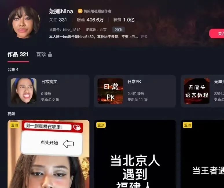 没成想,外国人的长相,京片子的口音,极大的反差加上丰富的内容,让妮娜得到了许多人的喜爱,粉丝一下冲到了400多万。