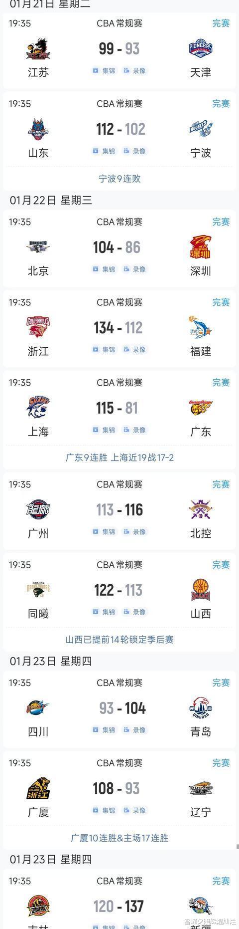 北京时间1月23日,CBA常规赛34轮的最后几场比赛开赛。辽宁队与广厦队的比赛中,辽宁队不敌广厦队,遭到双杀;新疆队在和吉林队的较量里轻松取胜,获得四连胜。下面是这两场比赛的综述,随着今日比赛结果的产生,积分榜也发生了变化。