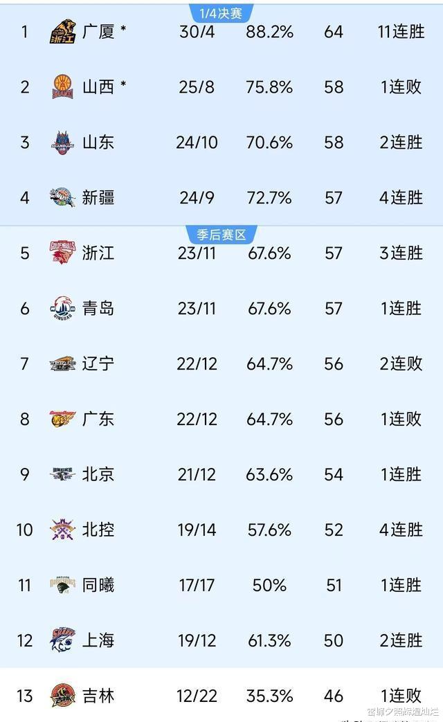 CBA最新积分榜更新,新疆重回前四,广东连续下滑跌至第八。目前4 - 8名的五支队伍仅仅相差2分,联盟第四的位置竞争十分激烈。