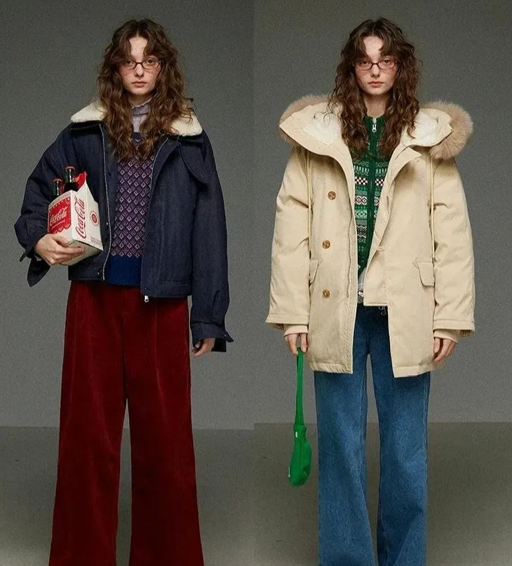 罂粟红色的棉衣,是一种特别浓郁的红色,可以在里面穿件藏蓝色的毛衣,红蓝撞色很有复古风格,带着些年代感,但又特别的显白时髦,配一条浅蓝色的牛仔裤,让整体的色调更明朗干净,这样的配色特别有新年的气氛,青春感十足。