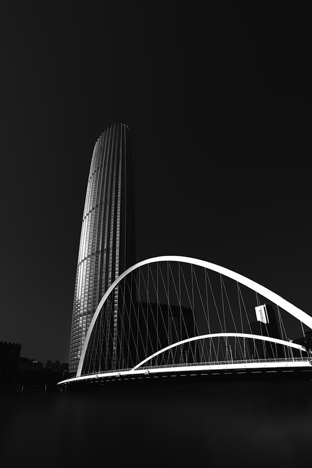 图三,在ACR中,选择色彩或者亮度蒙版,吸管选取桥梁的白色,然后对桥梁和拉索进行“提亮”。让它从背景里面出来,这一步为后期转黑白打下基础很重要。