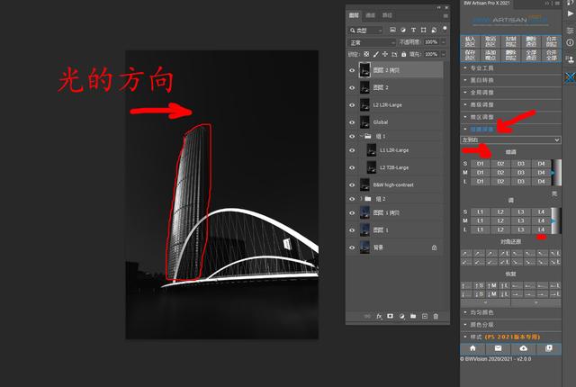 图四,用钢笔工具建立红色箭头处这个建筑的“选区”。然后用BWArtisan处理这个选区,这也是该软件的核心功能。具体过程为:1)在BWArtisan里选择“创建深度”功能。2)选择光影从左到右。3)点击L4。这个L4就是最亮。(以上红色箭头标记处),就一键渲染并得到了建筑影调的过渡。