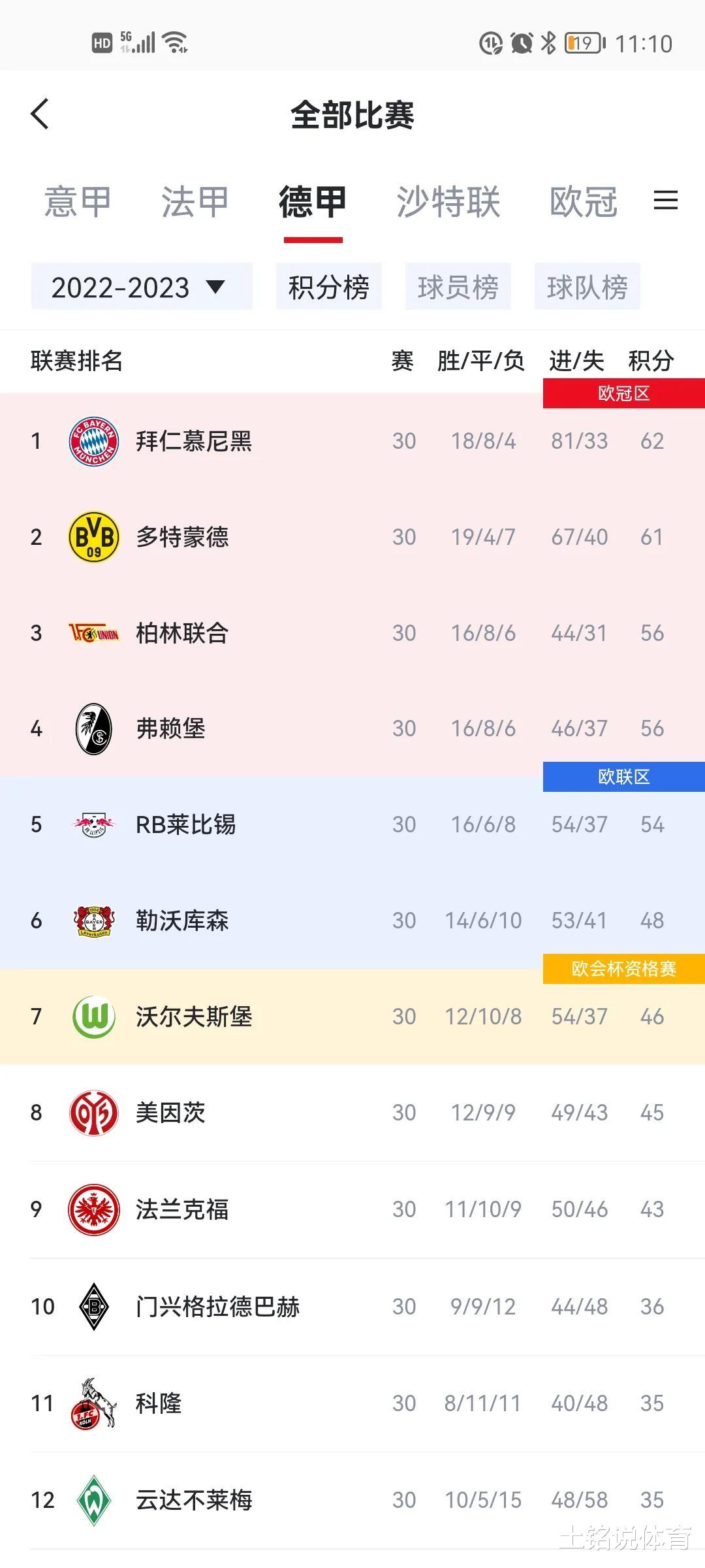 德甲这边拜仁和多特蒙德轮流坐头名的宝座,目前双方只差一分,联赛冠军的争夺还是非常激烈的。